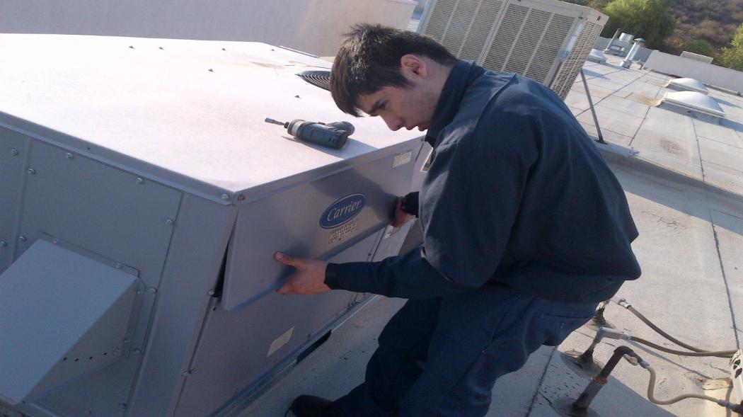 Union Apprentice Technician R.T.U John Robert is Servicing a 3 phase 5 ton Gas Electric package Carrier commercial unit .